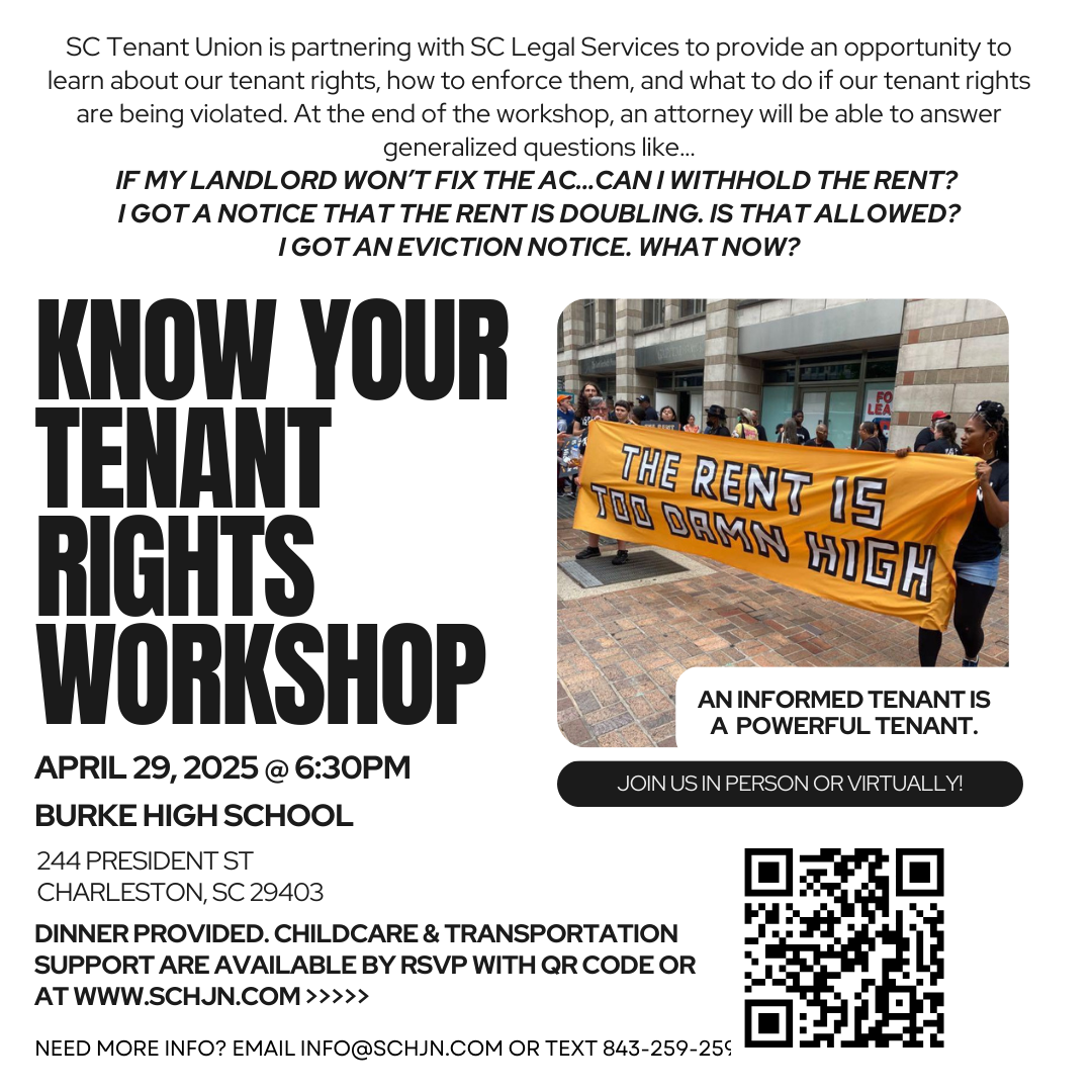 SC Tenant Union is partnering with SC Legal Services to provide an opportunity to learn about our tenant rights, how to enforce them, and what to do if our tenant rights are being violated. At the end of the workshop, an attorney will be able to answer generalized questions like...
